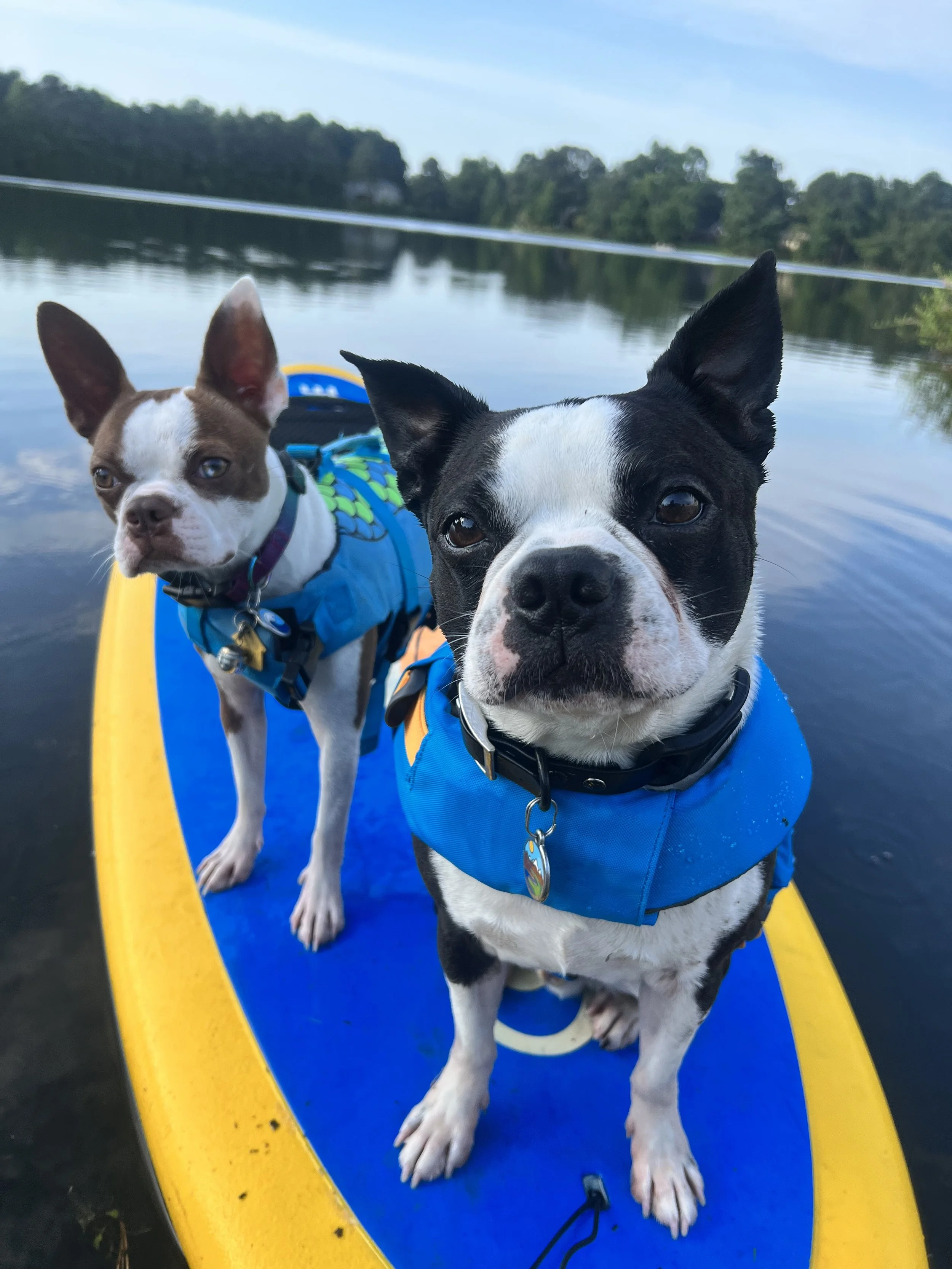 Hello and Woof! My name’s Brodie I’m a five year old Boston Terrier a certified therapy dog and a SUP DOG! I love being on the board and swimming in the water. I’m sure we’ll get a chance to meet on the water, along with the rest of the pack.